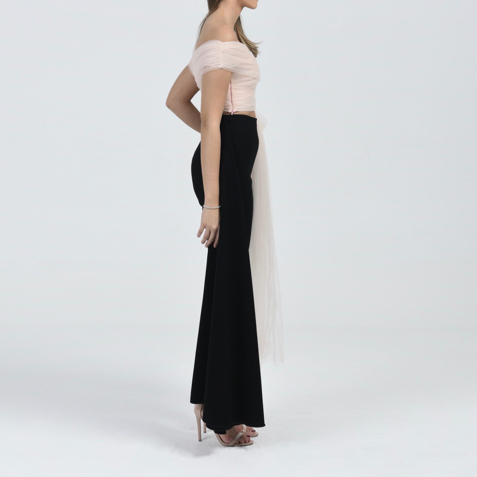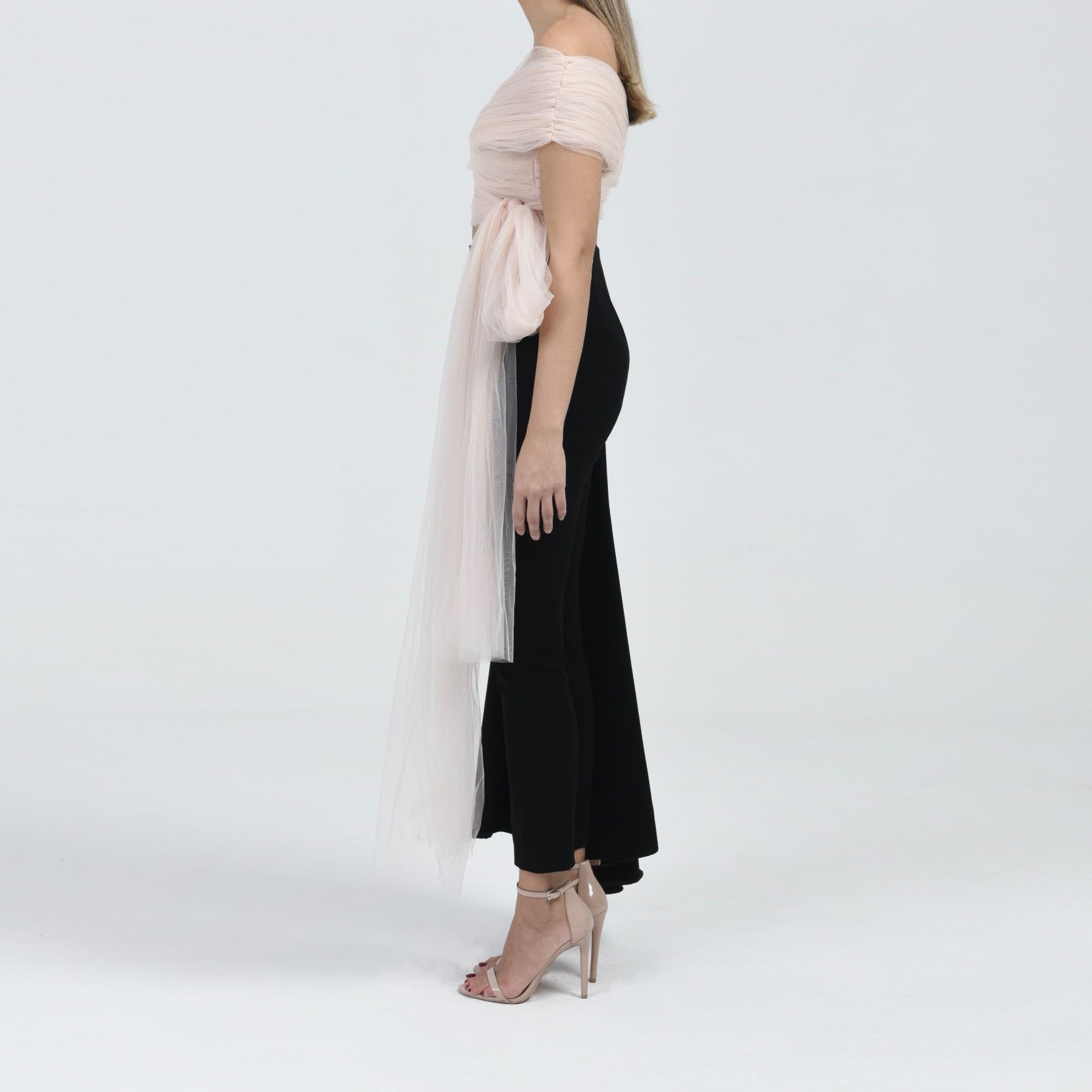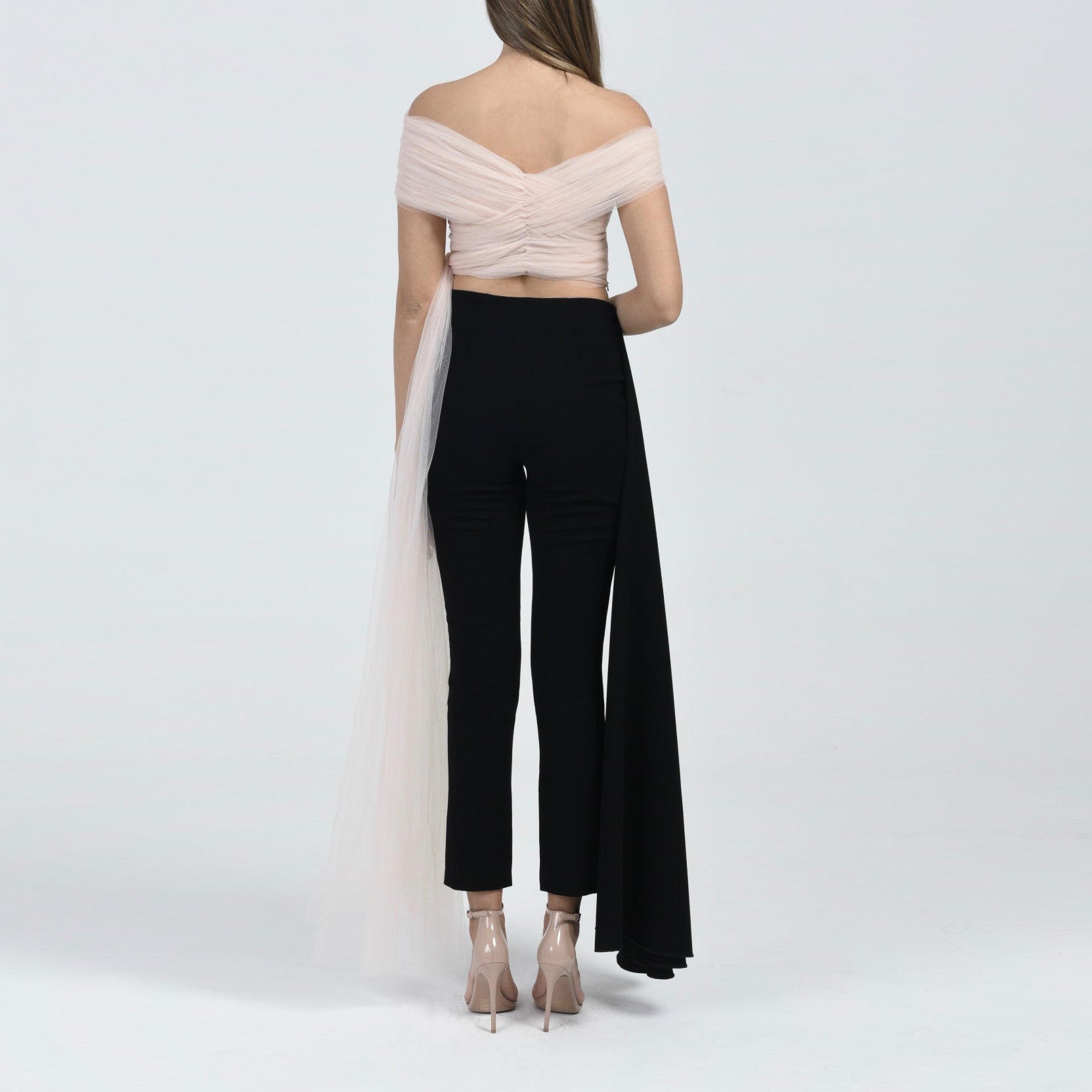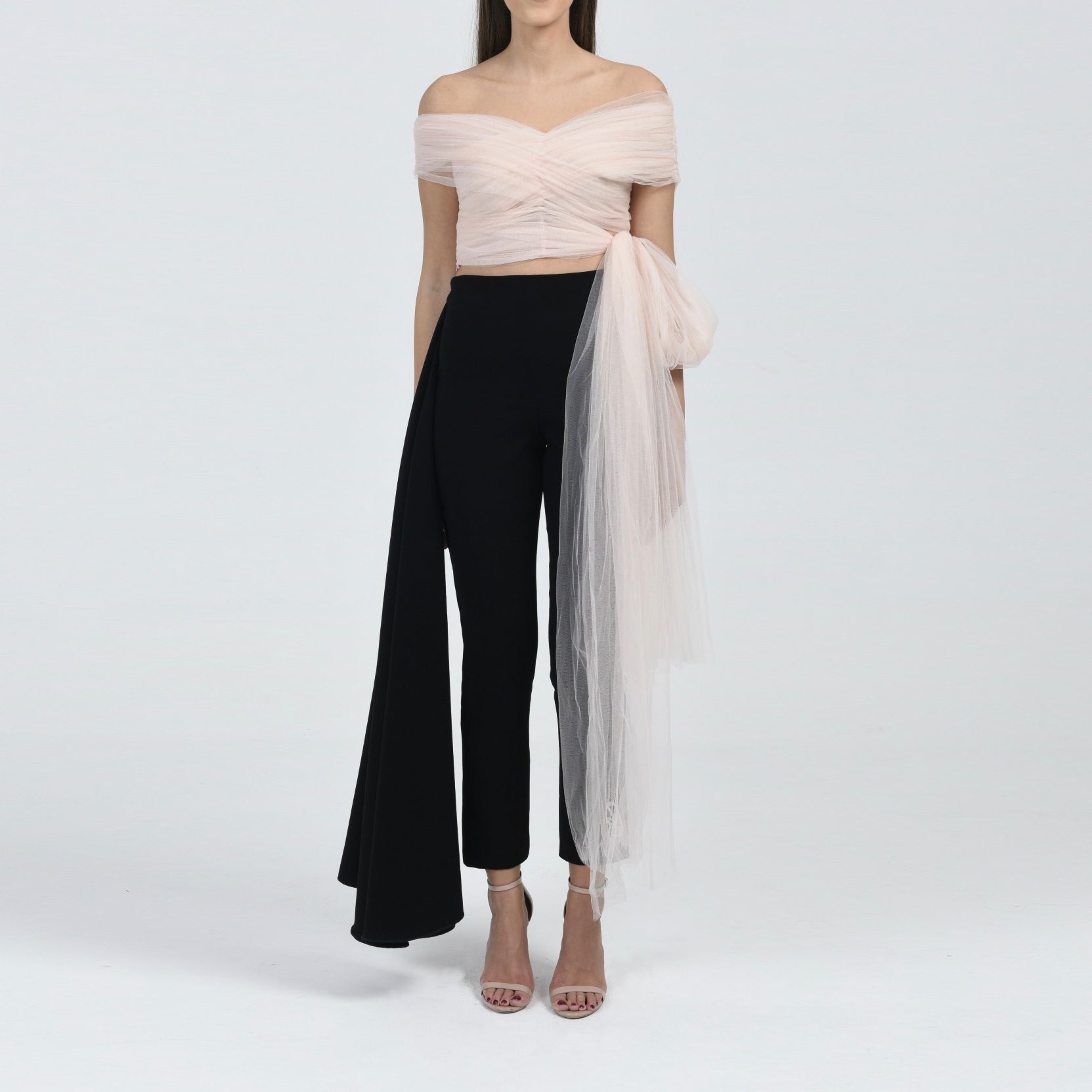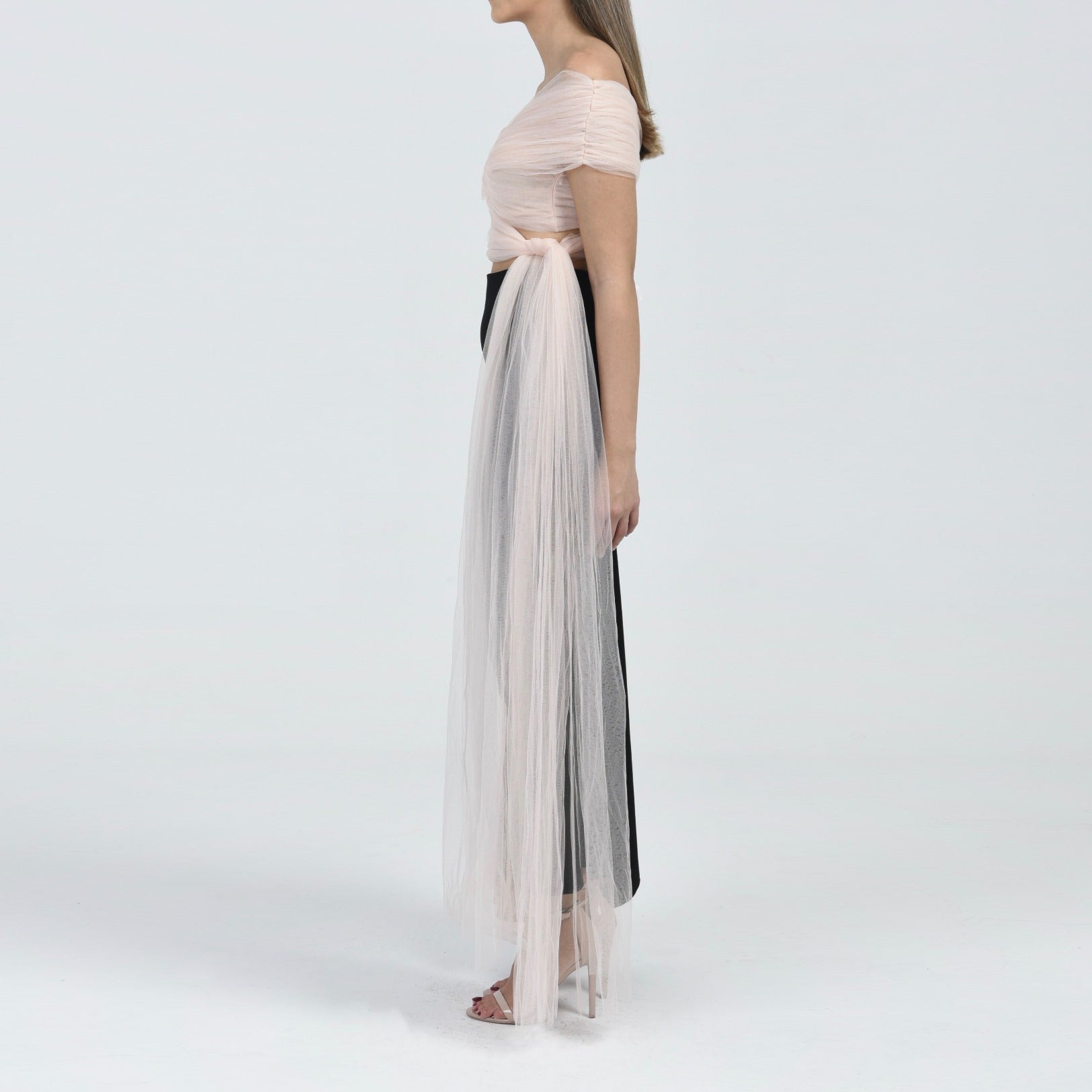 This tulle top is one of this season's bestsellers, with gathered tulle and an off-shoulder shape, and a wrap bottom making it a romantic piece that is a must have in every wardrobe.